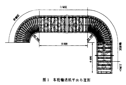 車輪滾筒輸送機是齊齊哈爾車輛廠自行設計制造的與引進輪軸精加工及組裝生產線配套的裝置,主要用于車輪的自動上料和運送。下面以該機為例,談談弧形動力式滾筒輸送機的設計與應用。