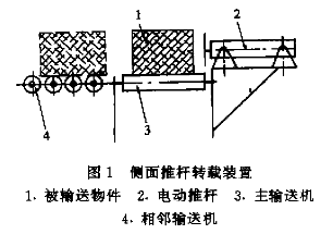 ①側面推桿轉載裝置如圖1所示,它主要是通過操縱往復式電動推桿2(或氣缸、液壓缸)推動被輸送物件1,使之離開主線輸送機3進入相鄰分支輸送機4。該推桿轉載裝置結構簡單,安裝方便。由于其工作方式是從物件側面推移,它的安裝方位隨相鄰輸送機的運行方向而定,且通常是安裝于主輸送機的側面,只需較小的地面空間。其缺點是因為它直接將物件從側面推入與主線輸送機呈90轉角的鄰近輸送機上.只適于物件作直角轉向,且不適于易碎、怕擠壓的物件。這種轉載裝置適用于輸送多種外形尺寸或重量范圍變化較大的物件。